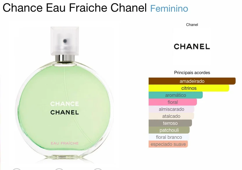 Chance Eau Fraîche é um perfume feminino fresco, vibrante e leve, combinando notas cítricas e aquáticas com um toque floral suave — perfeito para quem gosta de fragrâncias energéticas e alegres.