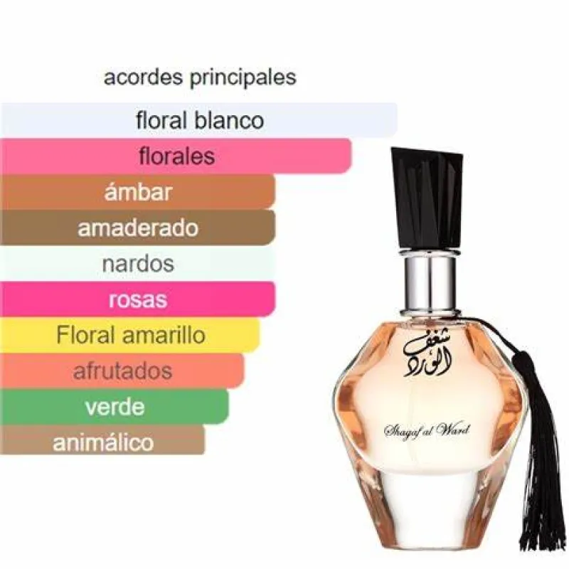 Shagaf Al Ward é um perfume feminino floral-oriental elegante e romântico. Sua composição destaca flores clássicas como rosa, jasmim e tuberosa, envolvidas por uma base amadeirada e levemente ambarada, criando um aroma feminino, sofisticado e envolvente.